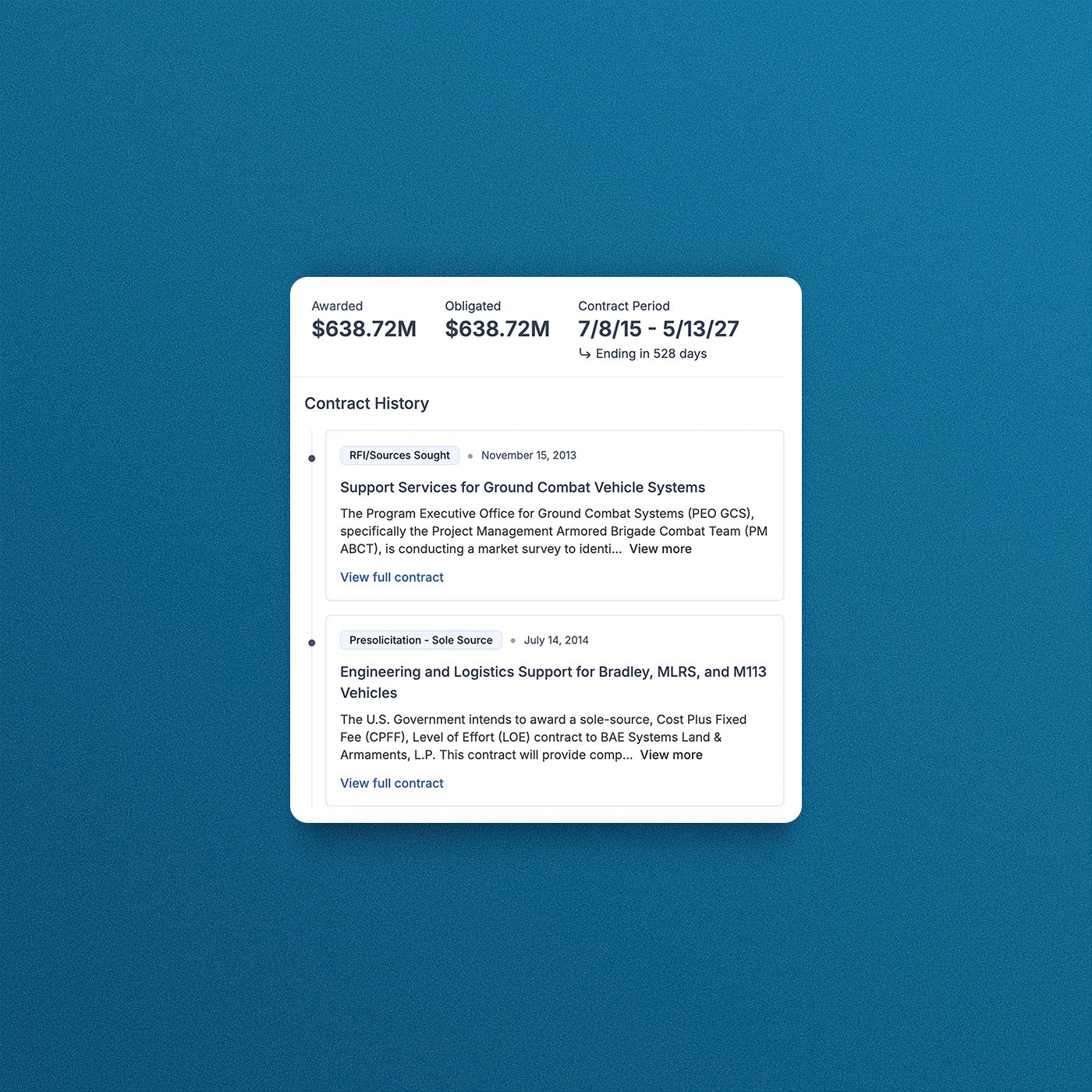 Analyze complete contract lifecycleโRFI to award, modifications, timelines, competing companies, and pricingโto understand what it takes to win the recompete.