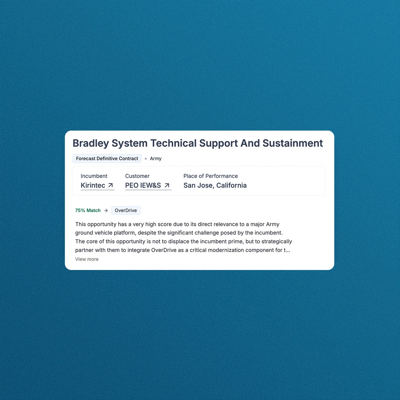 Every recompete gets a 1-100 match score based on your capabilities, target incumbents, and strategic priorities so you focus on opportunities where you're most competitive.