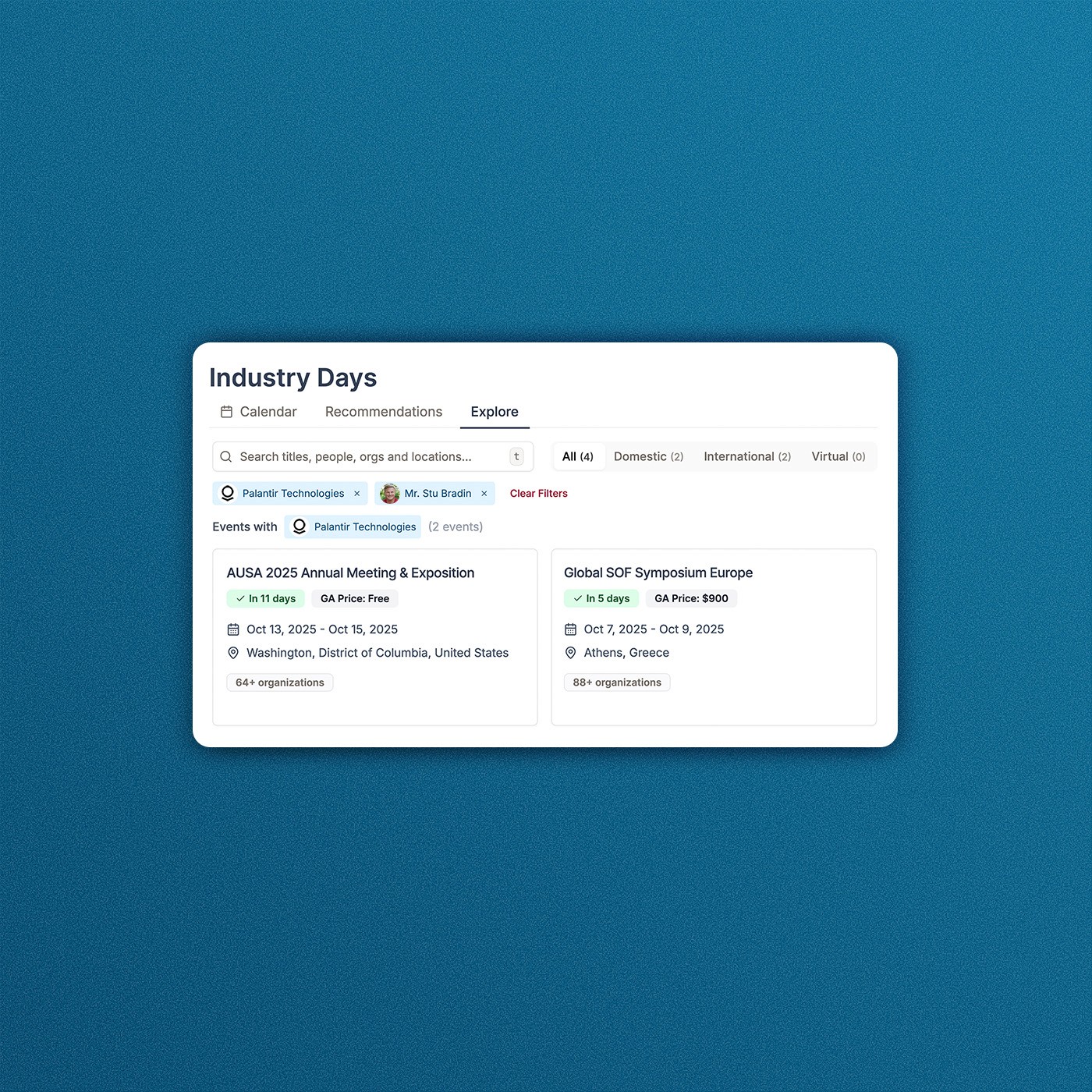 Track every industry day, conference, and speaking engagement where your target PEOs will present so you can build relationships and shape requirements face-to-face before the rebid.