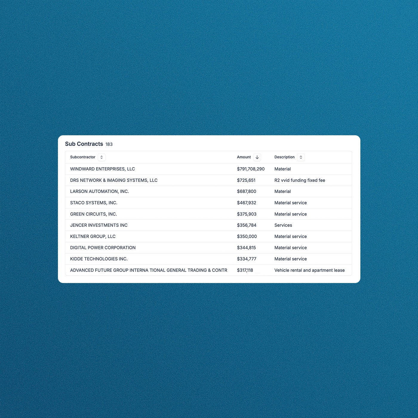See every subcontractor and delivery order on incumbent contracts so you build winning teaming packages based on proven relationships and performance.