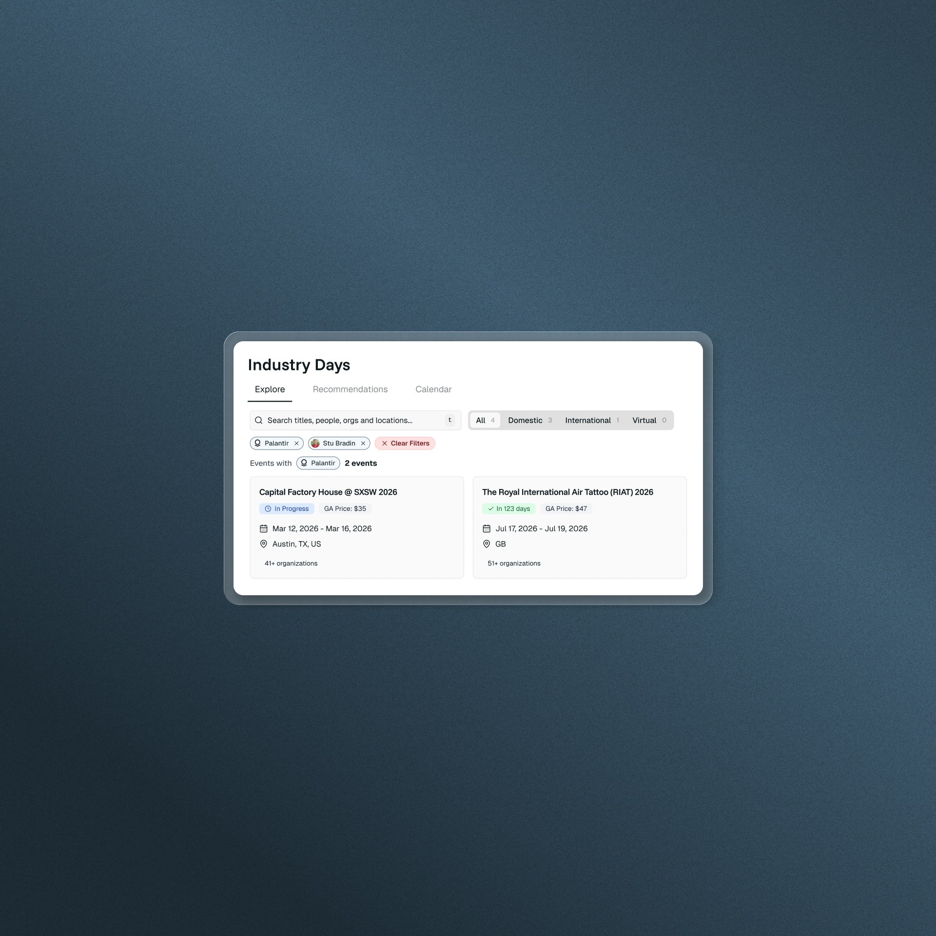 Track every conference, industry day, and event where your target agencies and competitors will be, so you can build relationships and gather intelligence before opportunities drop.