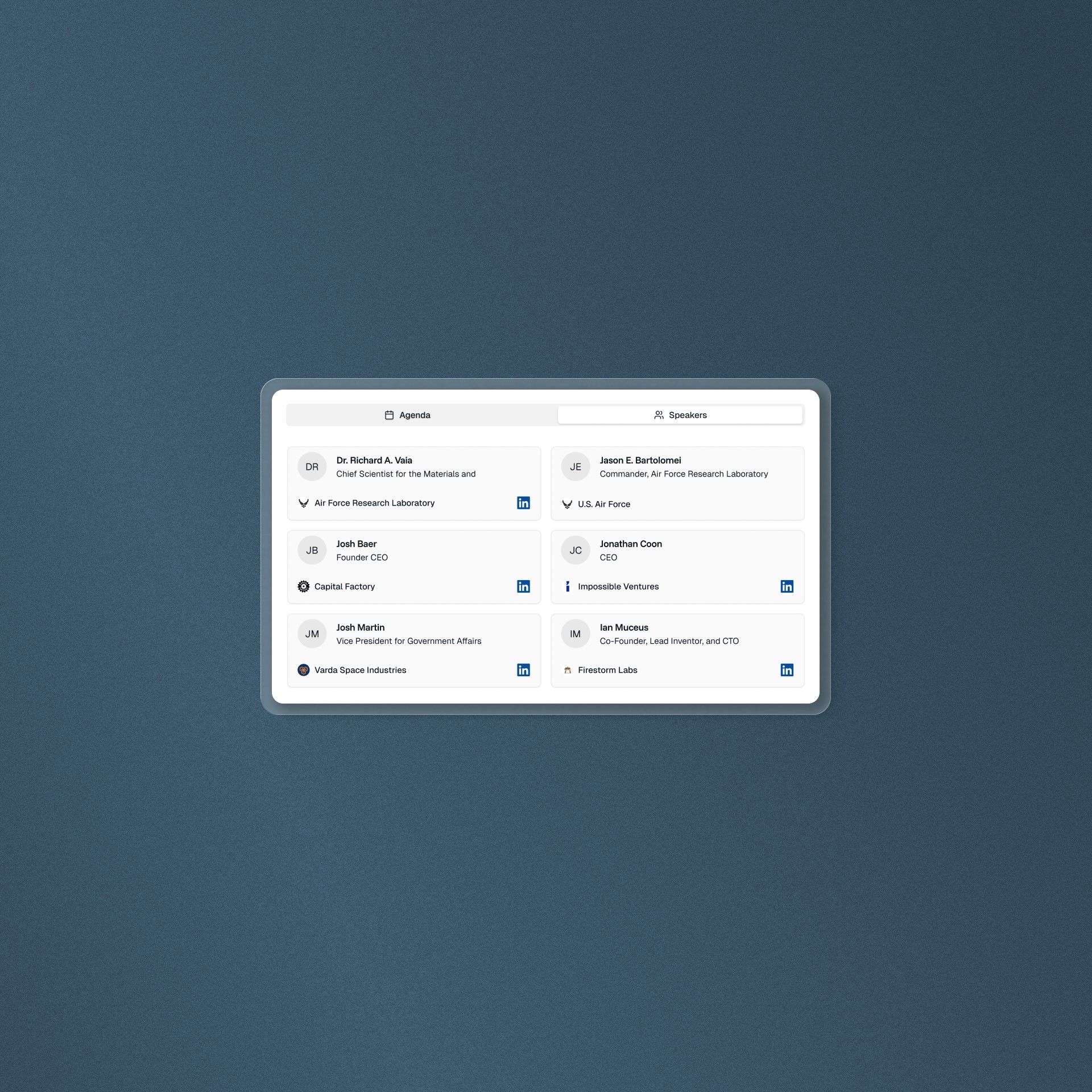 View full speaker lineups with names, titles, organizations, and LinkedIn profiles to build relationships before you arrive.