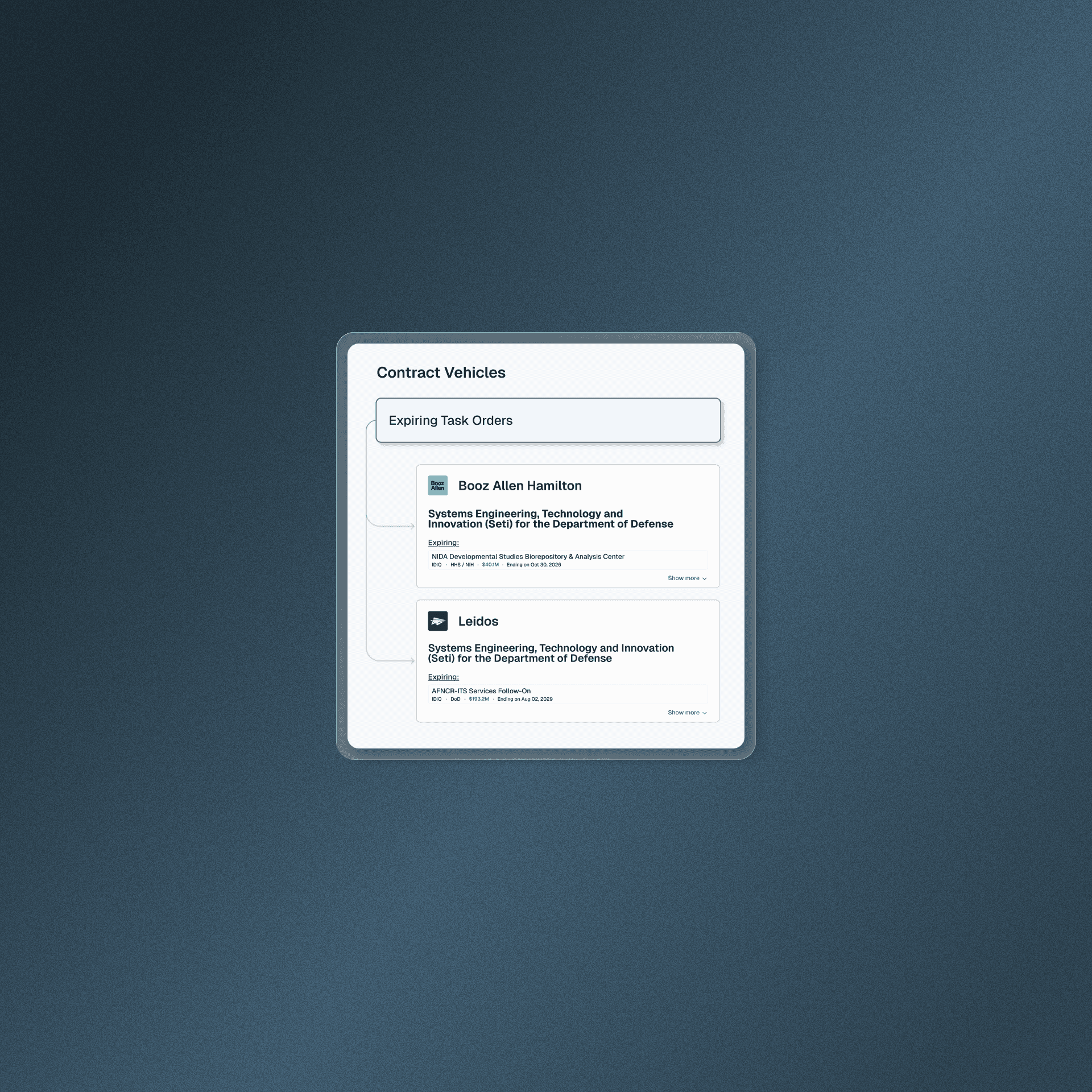 Track incumbent contracts across your target vehicles and get ahead of recompetes early enough to position your vendors.