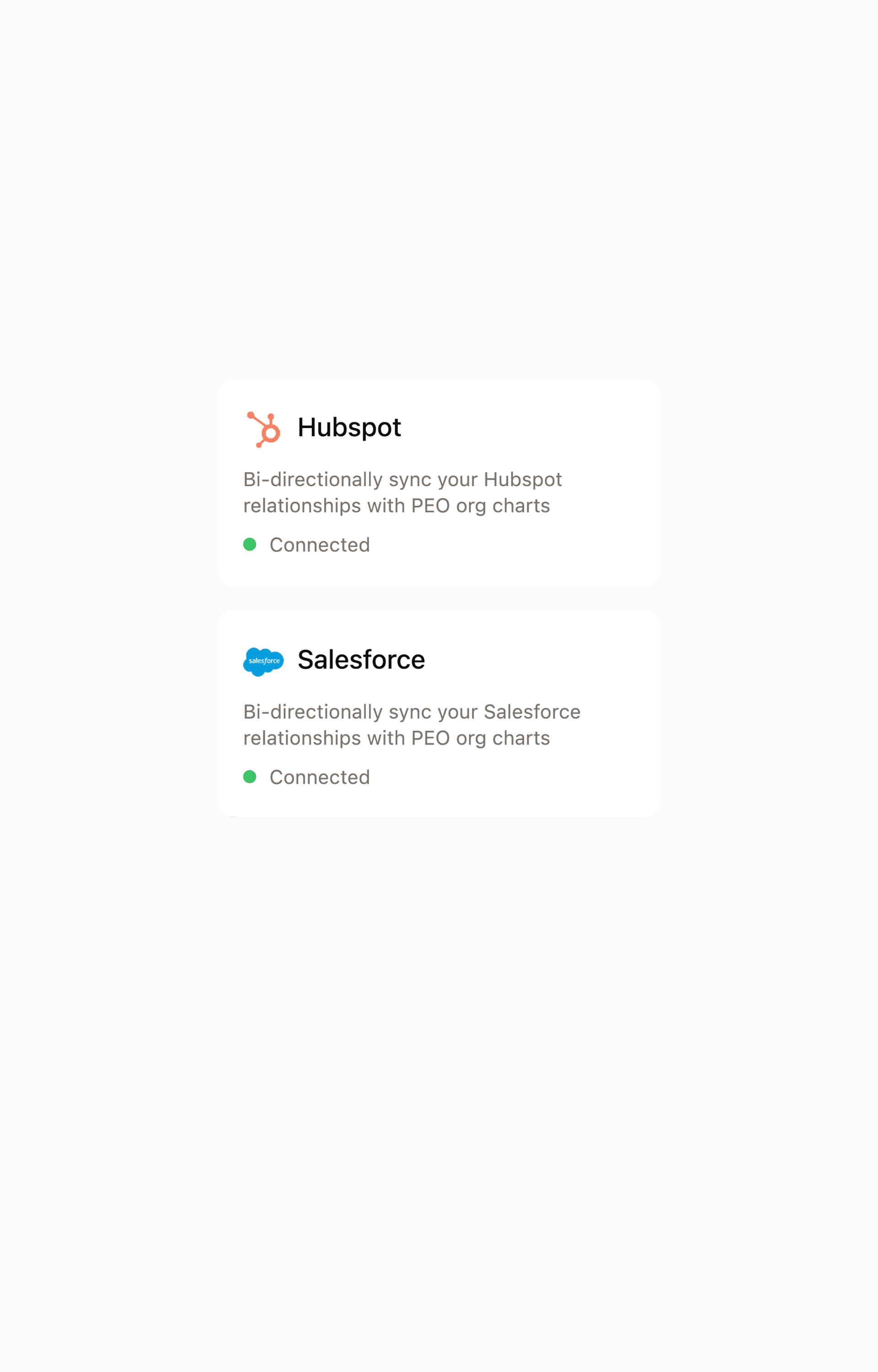 Connect Salesforce or HubSpot to map your existing relationships against every PEO org chart and identify warm opportunities.